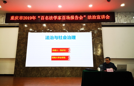 12月9日下午,重庆市2019年“百名法学家百场报告会”法治宣讲会在我校学术报告厅举行。报告会由副院长文斌主持,西南大学法学院张步文副院长作了题为《法治与社会治理》的专题报告,校党委书记刘波,副院长梁先勇,纪委书记朱传书,科级及以上干部,学工部,各院系专职组织员、思政教师及学生代表聆听了报告。